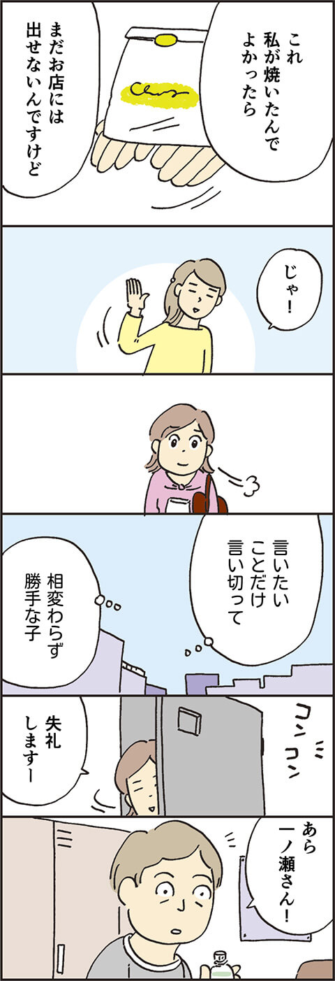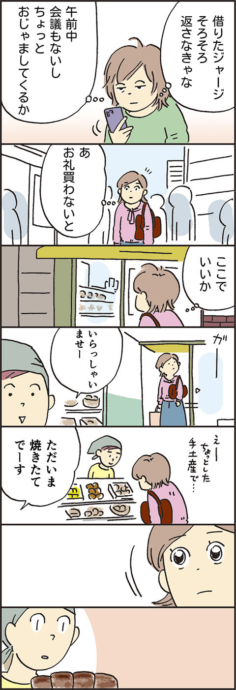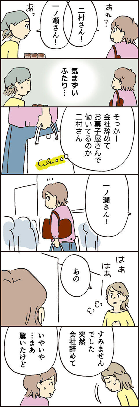 更年期の体をひきずり、お菓子屋さんに向かった圭子。突然の生理で服を汚したトラブルを救ってくれた清掃の女性(第2話参照)へのお礼を買おうとしたところ、まさかの再会があったようで……。