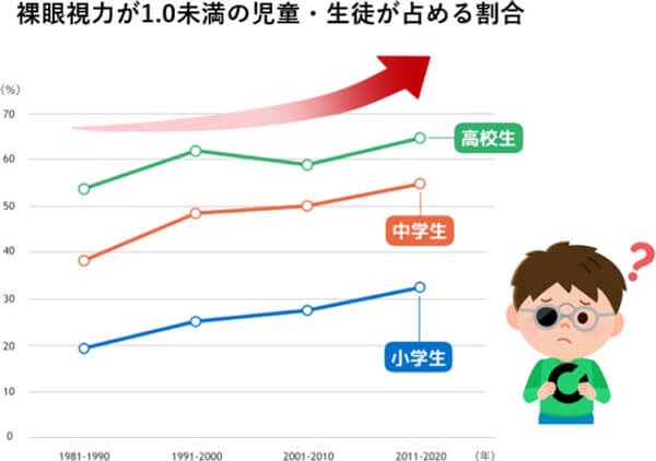 子どもたちの近視は、増加の一途をたどっています。2021年の学校保健統計調査(文部科学省)によれば、裸眼視力が1.0未満の児童・生徒が占める割合は、小学生が36.87%、中学生が60.66%、高校生が70.81%。上の図にもあるとおり、1981年から2020年までの間に、じりじりと上昇しています。