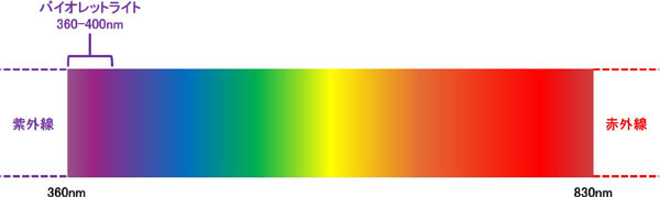 バイオレットライトとは、太陽光に含まれる紫色の光のこと。波長360〜400ナノメートルで、紫外線よりも波長が長く、目に見える光です(上図参照)。