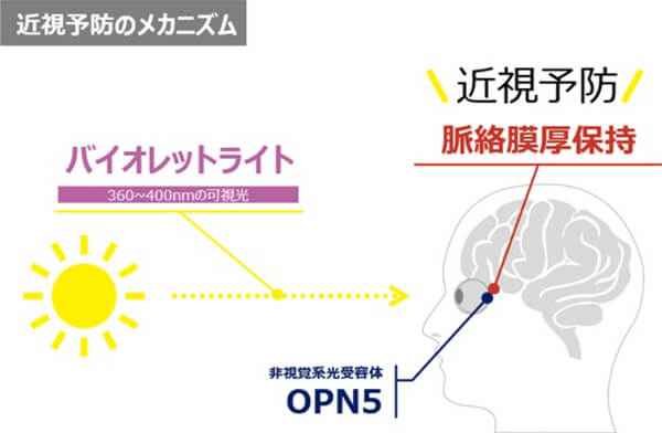 バイオレットライトが、OPN5と呼ばれる非視覚系光受容体を刺激して、眼の血流を増大させることで、近視を予防したり、進行を抑えたりすることができます。