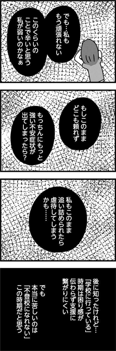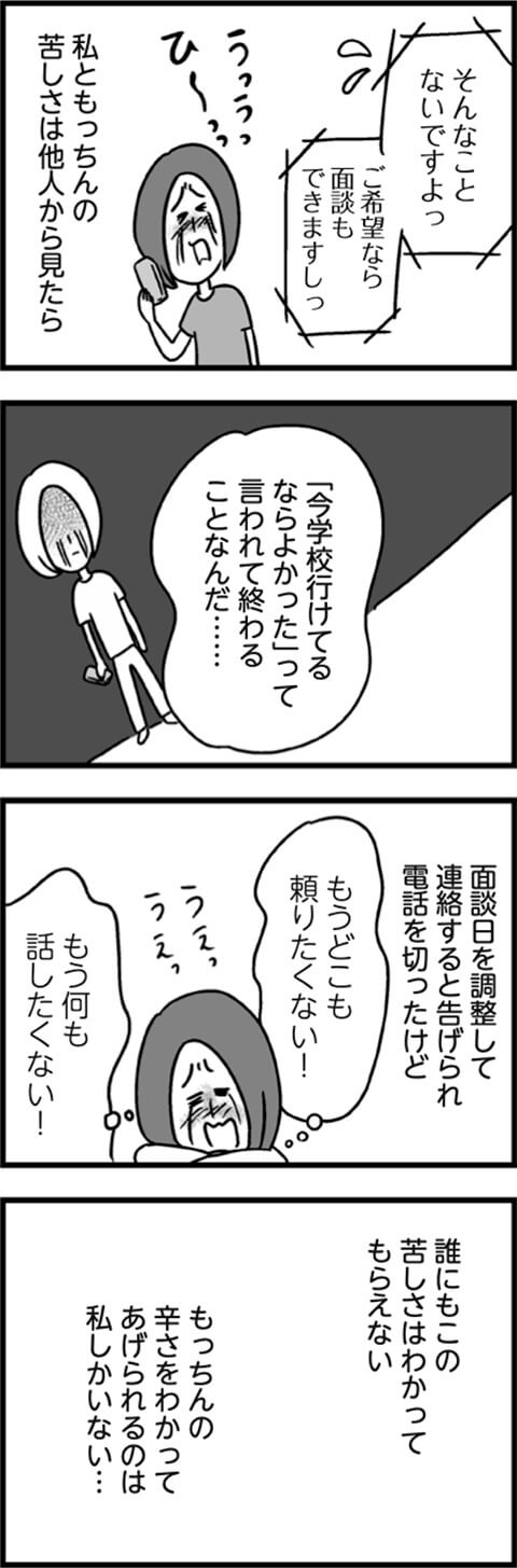 困っていることが、伝わらない。弱音をはくことすら認められないように感じる。不登校の保護者のかたには、どうにもならない苦しみの中にいるかたもいらっしゃるかもしれません。最終的にもっちん一家は、学校に行かない選択をしました。