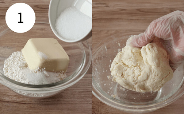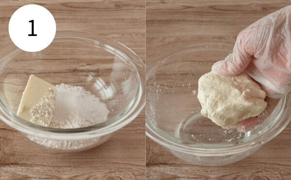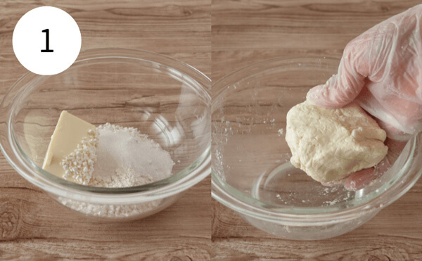 1. 1ボウルに、白玉粉・絹ごし豆腐・砂糖を入れ、ひと塊になるまでよく混ぜる。耳たぶくらいの固さになるまでこねる。生地が固い場合は水を少量足し、柔らかすぎる場合は白玉粉を加えて調整する。