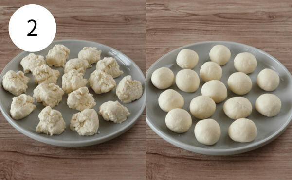 2. 生地を16個に分け、手のひらで丸める。表面にひび割れができないように丁寧に丸めるときれいに仕上がります。