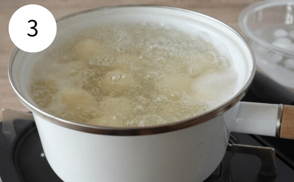 3. 事前準備で沸かした湯に、2で丸めた団子を1つずつ入れて茹でる。団子が湯の表面に浮いてきたら、さらに3分茹で、氷水に入れて冷やす。