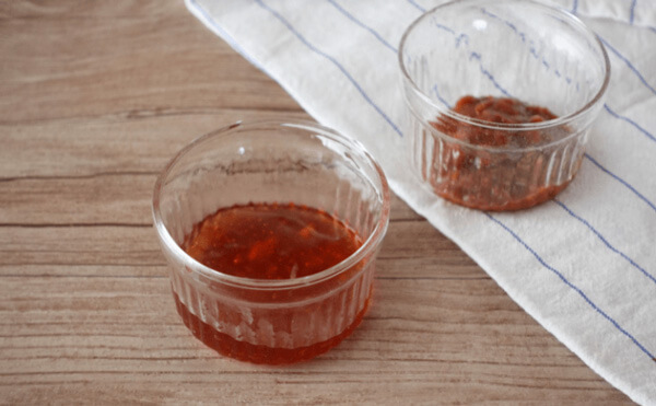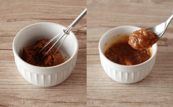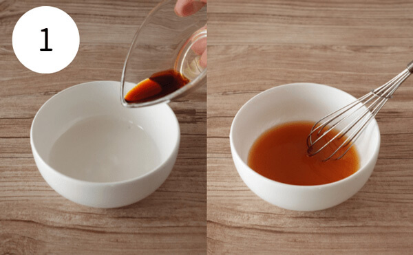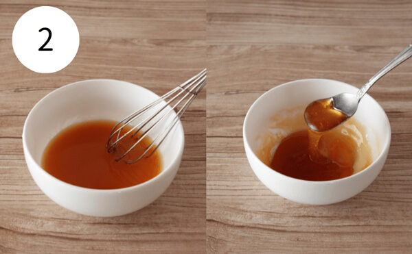 2. 1を600Wの電子レンジで20秒加熱し、泡立て器でよく混ぜる。さらに20秒加熱し、よく混ぜる。とろみがつき、タレが半透明になりツヤが出たら完成です。