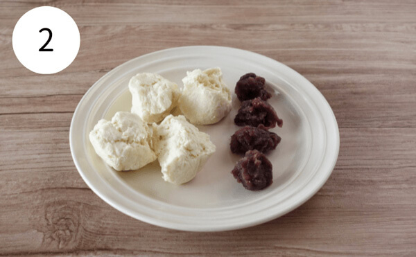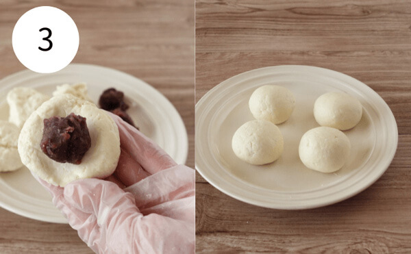 3. 2で分けた生地であんこを包む。表面にひび割れができないように丁寧に丸める。