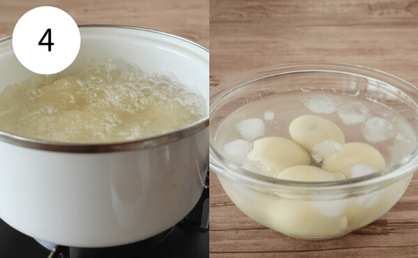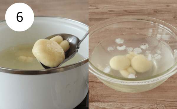 4. 鍋に湯を沸かし、沸騰したら3で丸めた団子を1つずつ入れて茹でる。団子が湯の表面に浮いてきたら、さらに3分茹で、氷水に入れて冷やす。