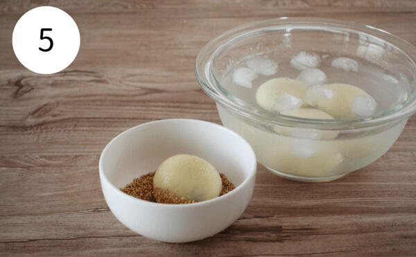 5. 団子を氷水で5分ほど冷やしたら、水を切ってごまをまぶす。団子の表面にごまがまんべんなくついたら完成です。
