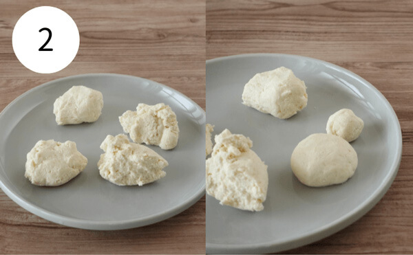 2. 1の生地を4等分し、1つの塊から8g分の生地を取り出す。