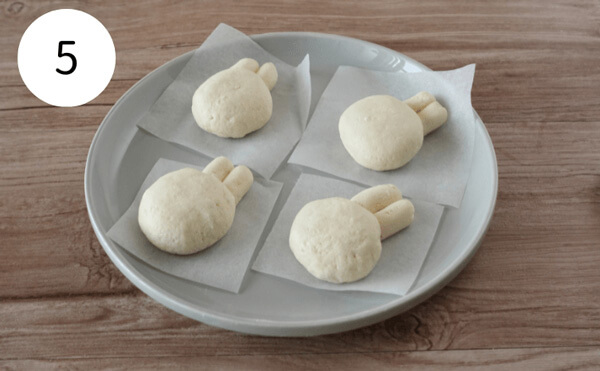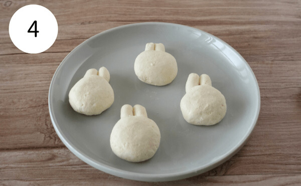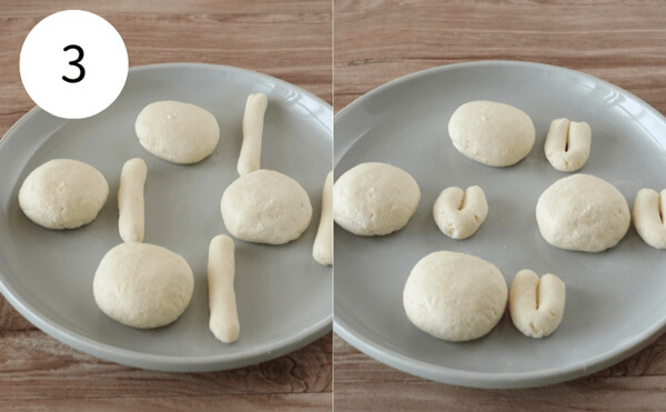 3. 2で分けた生地をそれぞれ成形する。大きい生地は手のひらで丸め、うさぎの顔を作り、小さい生地は5cmほどの長さに伸ばし、半分に折りたたんで耳の部分を作る。