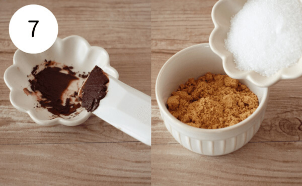 7. 純ココアに水を少しずつ加え、ペースト状になるまでよく混ぜる。きな粉に砂糖を加え、よく混ぜる。