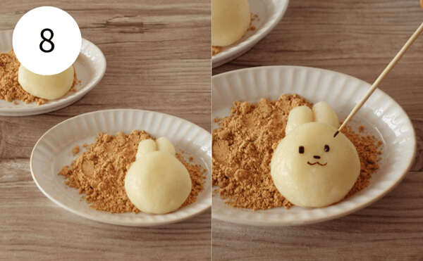 8. 皿に、きな粉とうさぎ団子をのせ、ココアペーストで顔を描いたら完成です。竹串や爪楊枝の先端にココアペーストをとり、団子の表面をなぞるように線を引くときれいに仕上がります。
