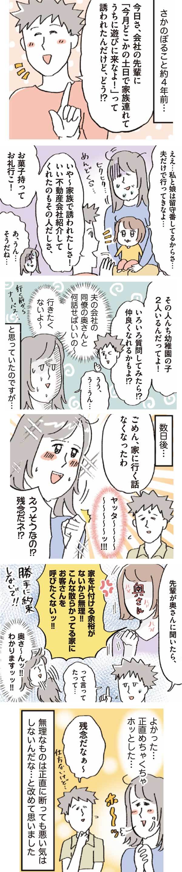 おやまさん:夫は以前、「さっき近所のパパさんにそこで会ったから、夜うちで家族で飲みましょうって誘ってきた!」と急に約束を取り付けてきたことがあり、「どうして相談なしで家に呼ぶの!?」とイラッとしたことがありました...。