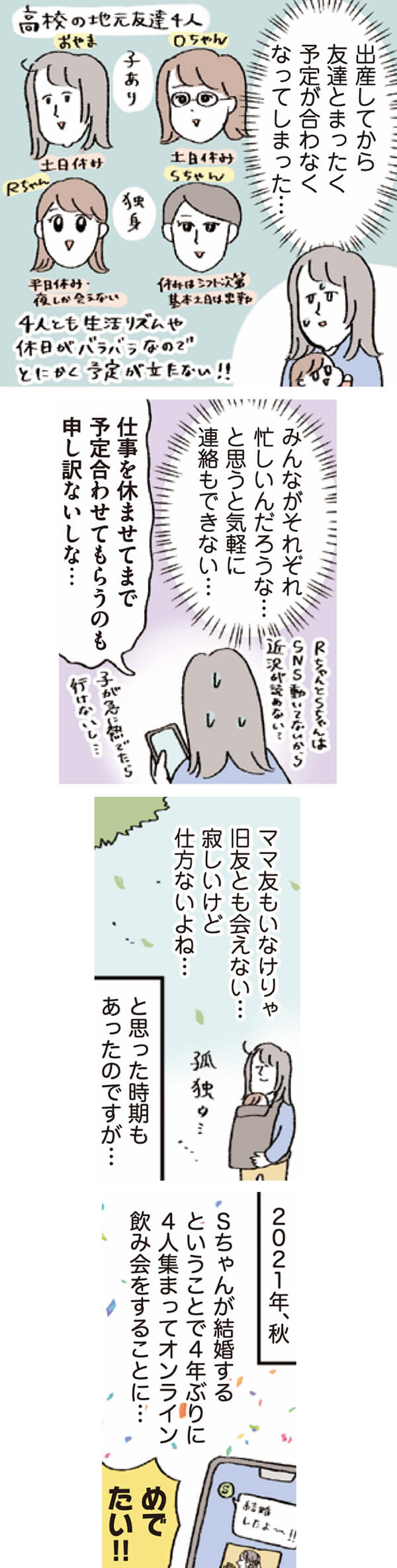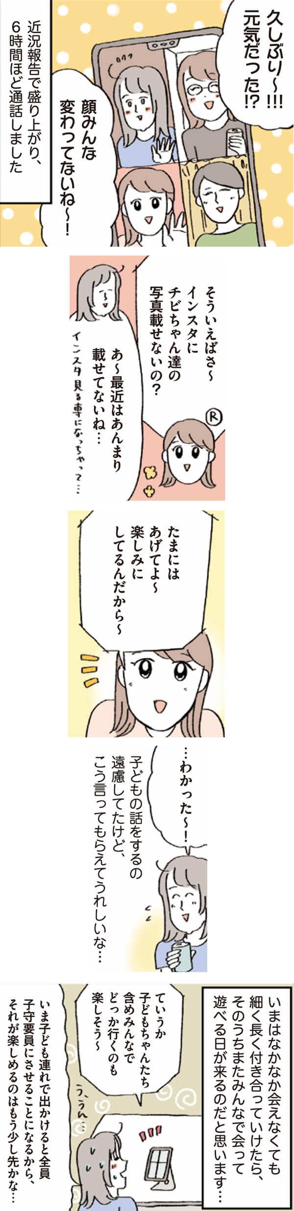 生活リズムの違う旧友とオンライン飲み会で旧交を温めたおやまさん。目の前のことで手一杯になりがちな赤ちゃんとの毎日の中で、楽しい時間は大切ですね。いつかまた、みんなで会う約束が叶いますように。