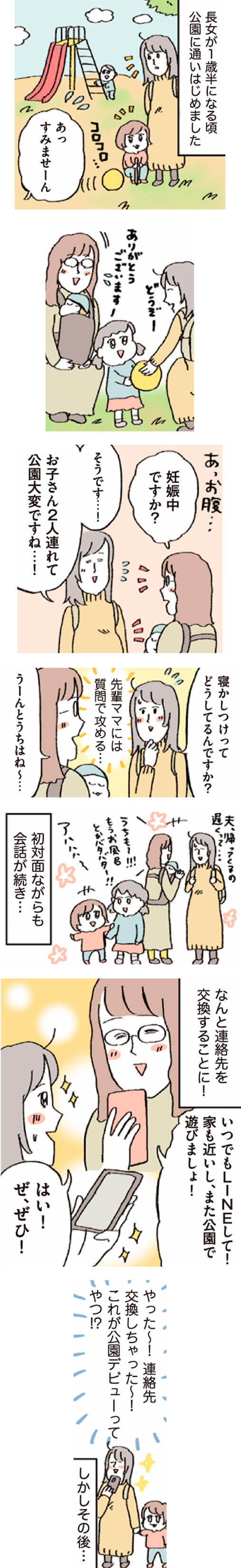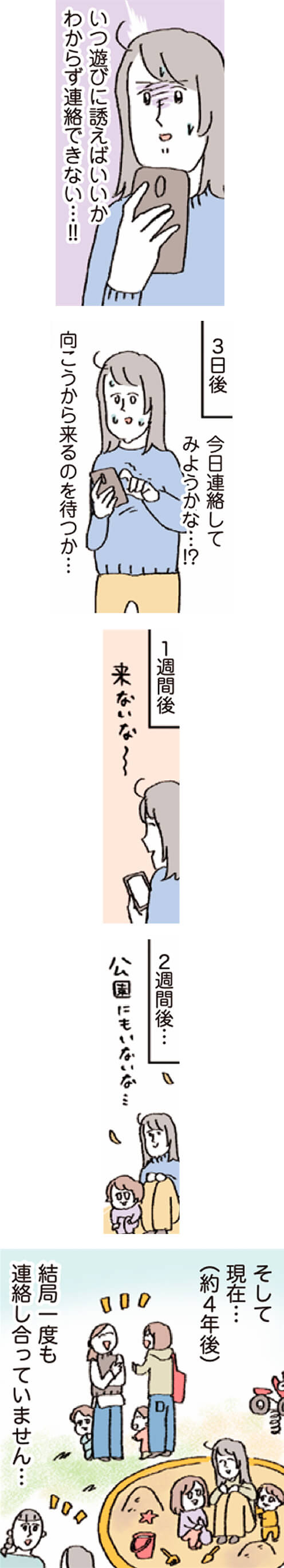 おやまさん:連絡先交換まではスムーズだったのに残念でした......。公園はさんざん行っていますが、他のママさんと公園で知り合って遊ぶような仲になることはいまだにありません。きっとこの先も公園で育まれるコミュニティーには入れないまま子育てを終えるのでしょう......。