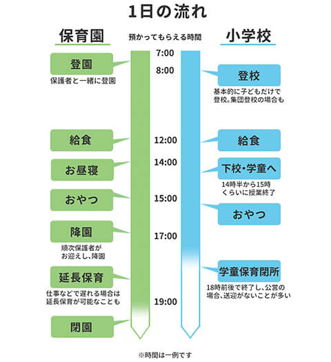 「保育園では、早朝保育が朝7時台からあり、延長保育は夜8時ごろまで対応してくれるケースが多々みられます。しかし、お子さまが小学校に入ると、登校するのは朝8時ごろと遅くなります。放課後は学童保育に託すご家庭が多いですが、公立の学童保育では早朝保育がなく、夜は6時ごろまでしか預けることができません。つまり、保育園時代は10時間以上お子さまを預けて働いていた人も、小学校では朝は1時間、夜は2時間程度預けられる時間が減ることになります」