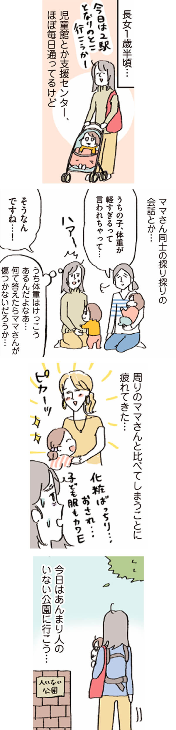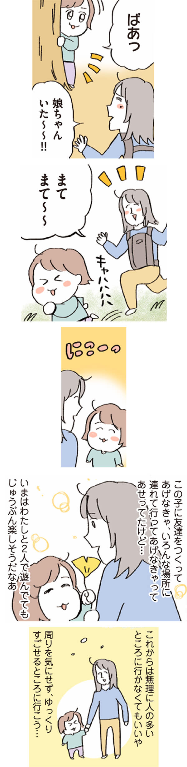 ある日、誰もいない公園でも私と楽しそうに遊ぶ娘を見て、無理に交流を求めて出かける必要もないのかも……と思いました。