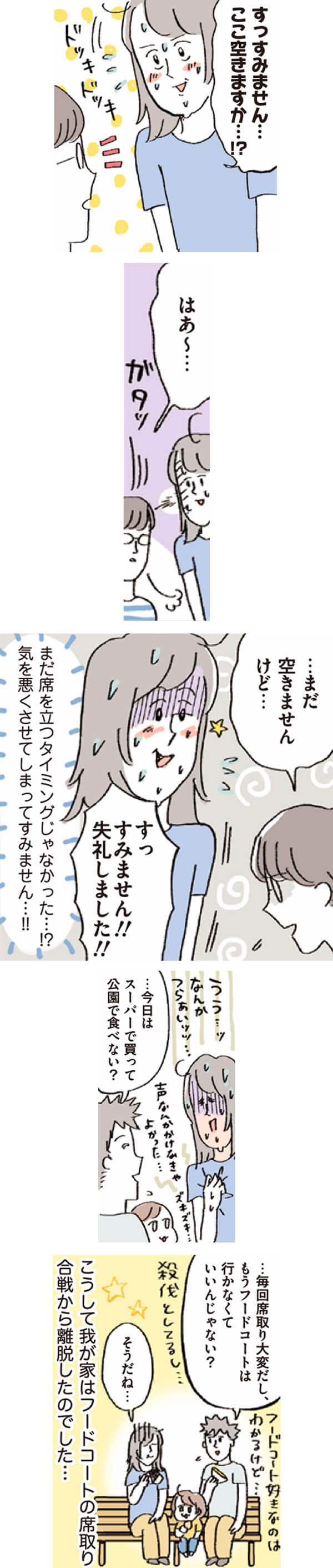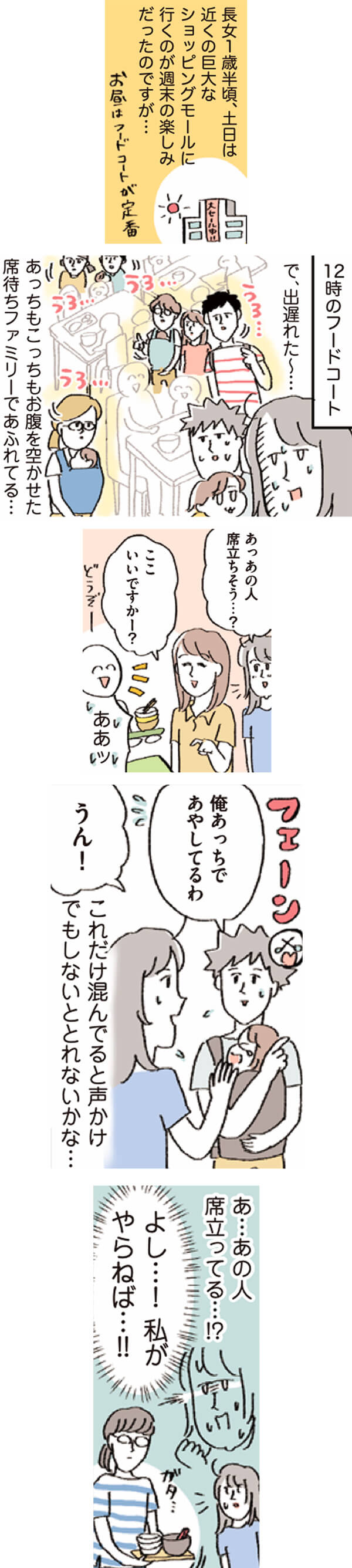 おやまさん:フードコート、もともとかなりガヤガヤしているので、子どもが多少グズっても目立たないところとか、各々好きなものを選んで食べられる気安さが好きでよく行っていたのですが、席取りだけはしんどかったですね~! 子どもが3人になってからは外食の難易度もかなりあがったので、コンビニで買ったおにぎりなどを公園や原っぱで食べているのですが、いろんな意味で気楽でいいです!