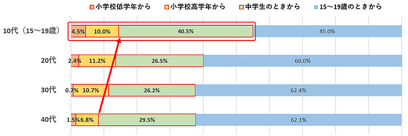 10代のコンタクトレンズ利用者の小中学生でのコンタクトレンズデビューは、40代の約1.5倍。コンタクトレンズデビューの「低年齢化」傾向が見えてきます。現在は、小中学校でのコンタクトレンズデビューが一般化しつつあると言えるのかもしれません。