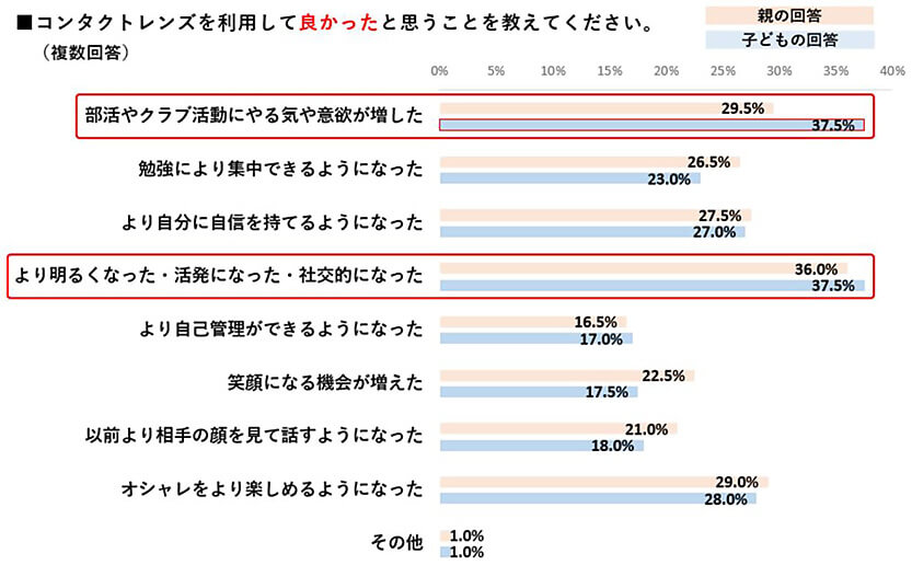 コンタクトレンズを使い始めた小中学生は、どのようなメリットを感じているのでしょうか。「コンタクトを利用して良かったと思うこと」を小中学生、保護者の両者に調査したところ、次のような結果となりました(※2)。