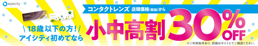 18歳以下のかた対象でアイシティをはじめてご利用の場合、30%オフとなっているのもうれしいポイントです。コンタクトレンズデビューをお得に進めてみませんか?