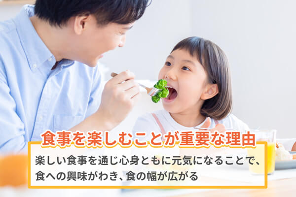 また、お子さまと食事を共にする保護者のかたは「自分が楽しく食べる」という意識も大切です。特に食事を作っていると、お子さまが食べなかった場合に、つい落ち込んだり、怒ってしまったりすることもありますよね。「子どもが食べないのは料理がイマイチなせい?」と自分を責めてしまうこともあるかもしれません。