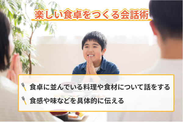 そんな時、会話の話題としておすすめなのは、食卓に並んでいる料理や食材について話をすること。食事の話題なら、食事への集中を妨げません。その際、ただ「おいしいね」というだけでなく、「今日のキュウリはいつもよりしゃきしゃきしてておいしいね」とか「カレーにハチミツを入れてみたよ。ほんのり甘さも感じない?」と食感や味などを具体的に伝えてあげるといいですね。そうすれば「ちょっと食べて確かめてみよう」という気持ちも刺激され、食感や味を言語化する表現力も磨かれるはずです。