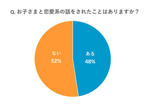 そもそも、家庭内で恋愛話をするのは一般的なことなのでしょうか。子育て中の保護者のかたにアンケートを実施したところ(※)、恋愛系の話をしたことが「ある」と答えたのは48%、「ない」と答えたのは52%という結果に。
