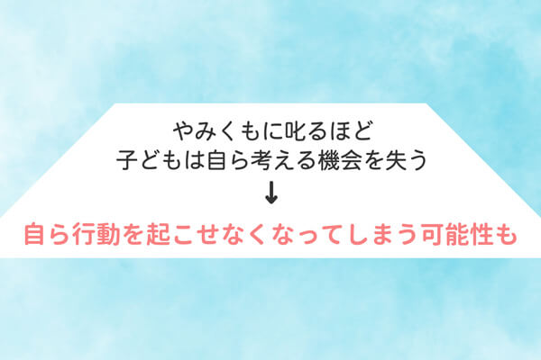 「叱る機会が増えると、お子さまは大人の言い付けをよく守るようになるかもしれません。なぜならお子さまにとって保護者のかたは、絶対的な権力者だからです。しかし大人が叱れば叱るほど、子どもは自ら考えたり学んだりする機会を失うことになります。子どもは『何が悪かったのかわからないけれど、叱られるのは怖いから言い付けを守ろう』と考えるからです」(村中先生)