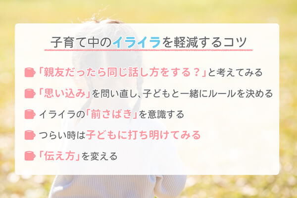 子育て中に感じるイライラをゼロにはできなくても、自身の考え方やお子さまへの関わり方を少し見直してみることで、怒りを軽減することは可能です。