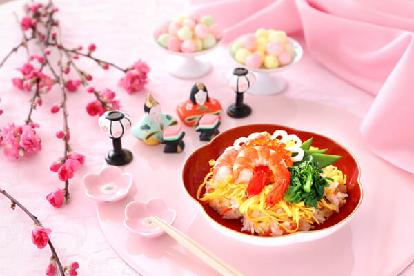 ひな祭りは、3月3日の「桃の節句」に行われる女の子の健やかな成長と幸せを願う行事。ひな人形を飾り、桃の花を添え、ひし餅やひなあられなどひな祭りならではの食べ物を楽しみながら、健やかな成長を祈ります。