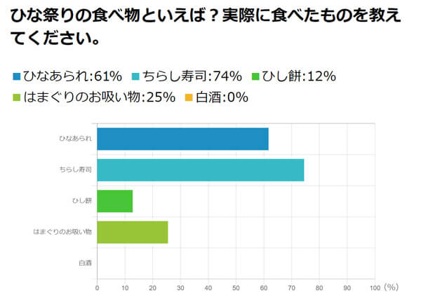 子どものいる家庭では、ひな祭りで実際に何を食べているのでしょうか。保護者のかたにアンケートで昨年のひな祭りの日に食べたものを聞いてみました(※1)。