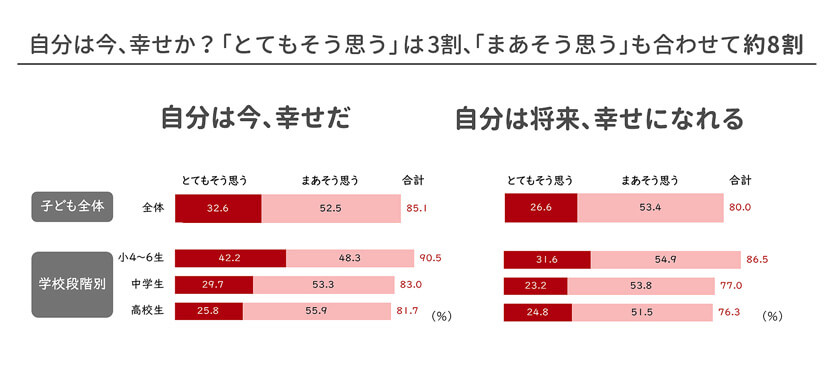「今、幸せだ」と感じている子は約8割。年齢が上がると下がる傾向