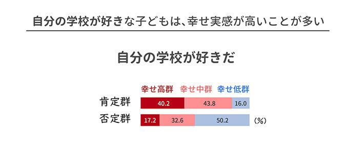 学校が好きだ、授業が楽しいなどと感じていたり、尊敬できる先生がいたりすると、「幸せ実感」が高い傾向が見られます。
