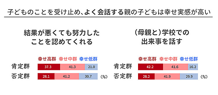 たとえば、保護者が「勉強で悩んだときに相談に乗ってくれる」「結果が悪くても努力したことを認めてくれる」と答えた子どもは、そうでないと答えた子どもと比べて、「幸せ高群」が10ポイント程度高い結果が出ました。また、親とよく会話している子どもは、「幸せ実感」が高いこともわかりました。