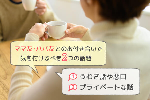 ママ友・パパ友との会話には、トラブルのタネになりうる話題も……。盛り上がった勢いで話してしまったことが思わぬ事態に発展しないよう、次の3つに気を付けていきましょう。