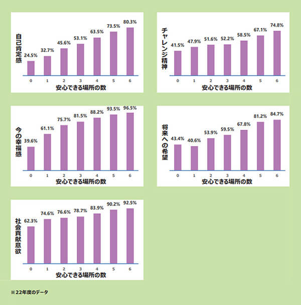 その結果、居場所が多い人ほど、自己肯定感やチャレンジ精神、充実感などが高い傾向が見られたのです。