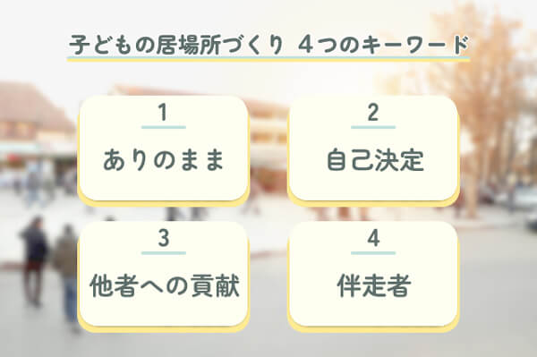 「自分にとって心地よい居場所かどうか」を決めるのは子ども自身ですが、そのポイントを私は、「ありのまま」「自己決定」「他者への貢献」「伴走者」という4つのキーワードで考えています。