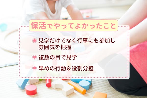 実際に保活を体験したからこそ実感した「保活成功のためのコツ」もご紹介。先輩たちからのアドバイスをご自身の保活に生かしてくださいね。