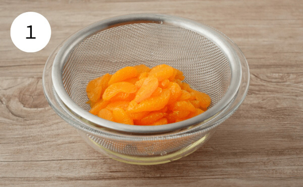 1. みかんの缶詰は、みかんとシロップに分ける。シロップは、のちほど紹介するレシピで使用します。