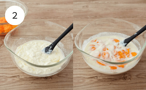 2. プレーンヨーグルトにはちみつを入れ、溶けるまでよく混ぜる。みかんをこのボウルに入れ、さっと混ぜる。