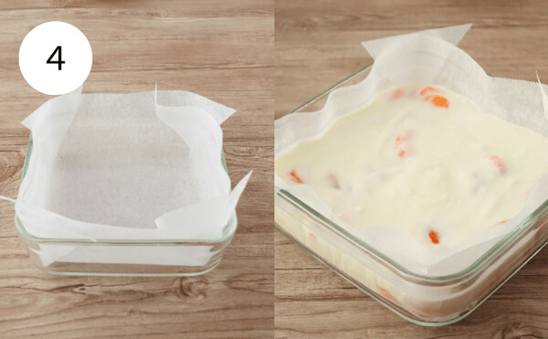 4. クッキングシートを容器に敷いて3を流し入れ、冷凍庫で4~5時間固まるまで冷やす。