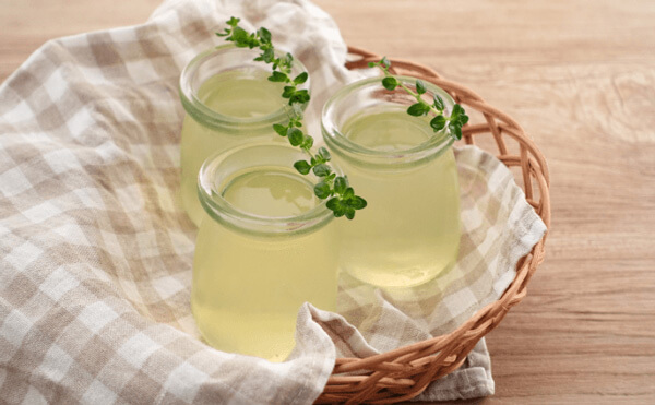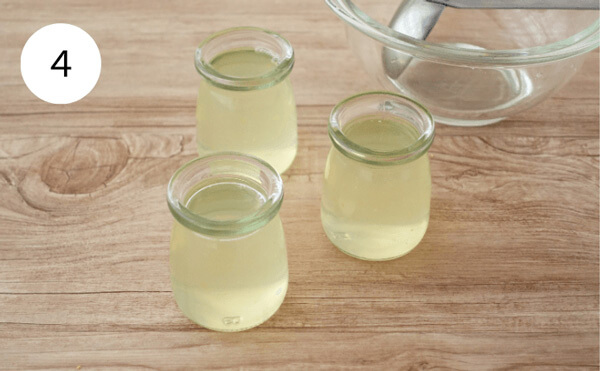 4. 好きな容器にゼリー液を入れ、冷蔵庫で3~4時間冷やし固める。仕上げにタイムの葉を飾ると清涼感がアップします。