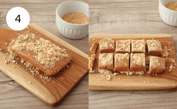 4. きな粉生地を食べやすい大きさに切る。少量のトッピング用きな粉を生地にまぶすと切りやすくなります。