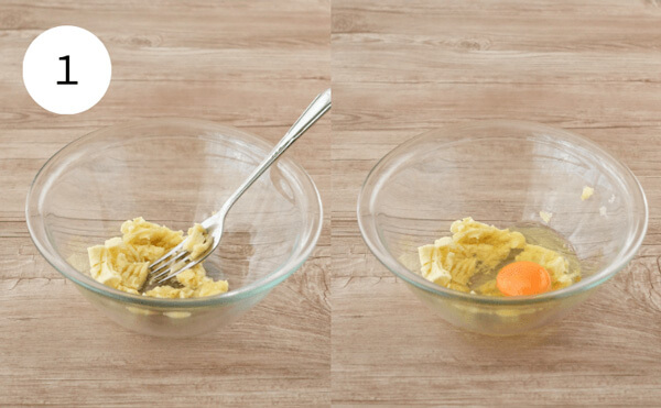 1. バナナをフォークで荒くつぶす。そこに、卵とはちみつを加える。