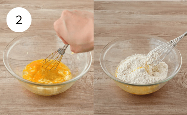 2. 卵とはちみつを20回ほどかき混ぜ、ホットケーキミックスを加える。