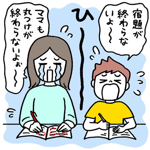 「ねえ、ママ(パパ)、丸付けまだ?」「ごめん、今やろうと思ってたところ(泣)」令和の小学生家庭の宿題にまつわる会話は、昭和・平成と逆転現象が起こっている……かも!? 「長期休暇のワークは保護者採点でした」と少々お疲れな声も寄せられていました。