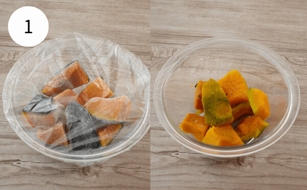 1. 耐熱ボウルに冷凍かぼちゃを入れ、ふんわりラップをして600Wの電子レンジで1分30秒加熱する。半解凍状態でかぼちゃの皮をむき、600Wの電子レンジで1分追加で加熱する。