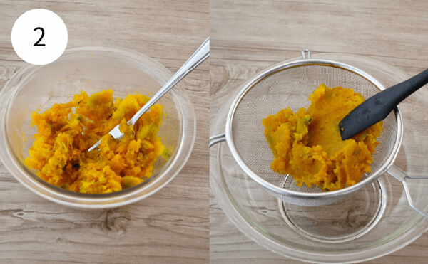 2. 1のかぼちゃをフォークでつぶし、ザルでこす。こすことで余分な繊維が取り除かれるため、口当たりがよくなる。