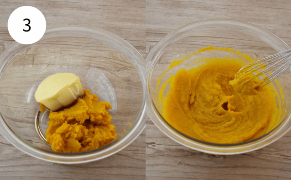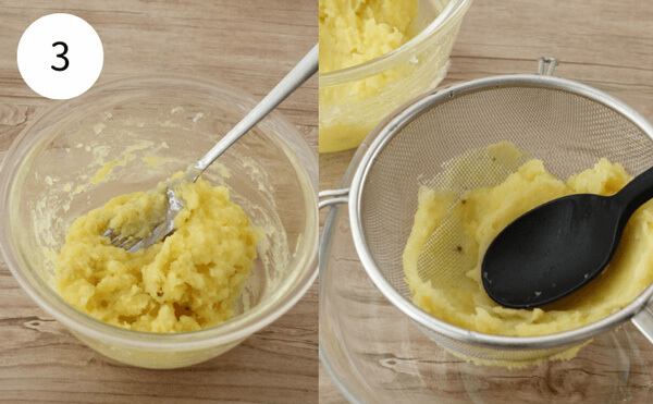 3. 2のさつまいもをフォークでつぶし、バター、スライスチーズ、砂糖を加えよく混ぜ、ザルでこす(こす作業は省いてもかまいませんが、漉すと口どけがよくなります)。